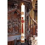 note: A large wax-candle burned before the altar. From the old French cierge/cirge from Latin cereus (waxy) from cera (wax).