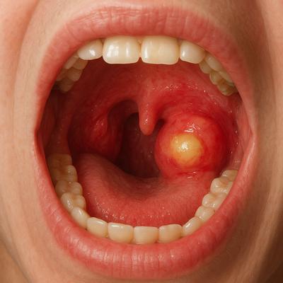 note: The word quinsy comes from Middle English which is a corruption of the Greek word kynanchē meaning dog strangulation. This name was likely given because of the way a person with the condition (a peritonsillar abscess) throws open their mouth in distress. The Greek term is made up of kyn- (dog) and anchein (to strangle).